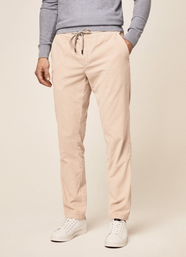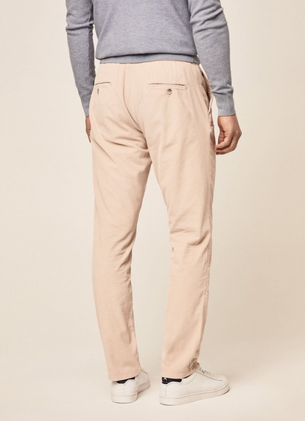 - Slim fit - Nastavitelný pas stahovací šňůrkou - Přední boční kapsy - Zadní lemovaná kapsa s knoflíkem - Složení: 100% bavlna