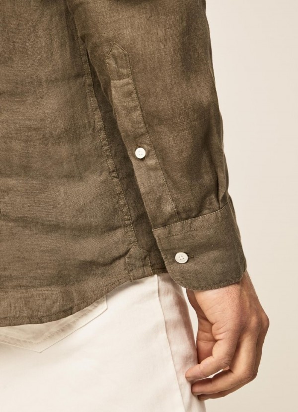 Tato slim-fit košile vyrobená ze 100% lnu technikou barvení oděvů je dostupná v široké škále letních barev. Má sofistikovaný mandarinkový límec a naše odpovídající vyšívané logo na hrudi.