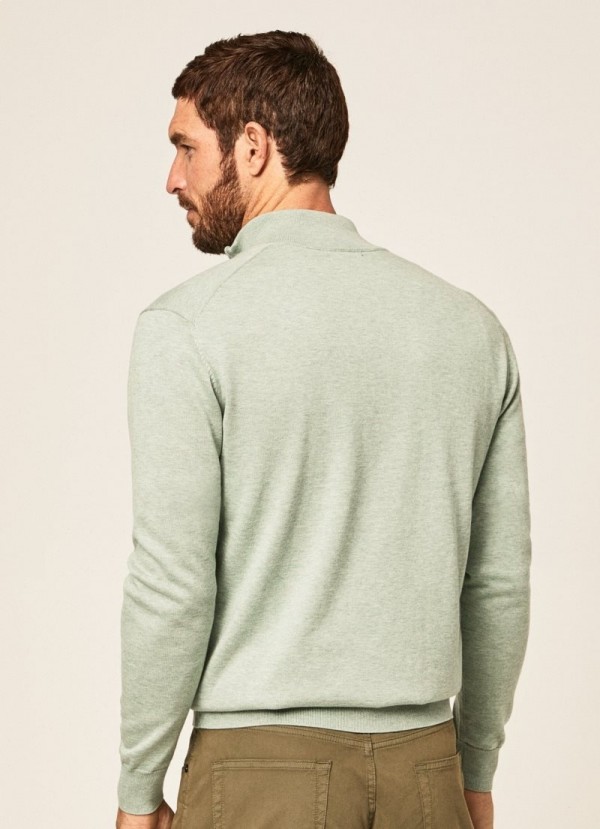 Jersey de cuello con media cremallera confeccionado en algodón y seda. Esta prenda es ideal para llevar en salidas de fin de semana de entretiempo. Combínala con uno de nuestros pantalones de 5 bolsillos.
