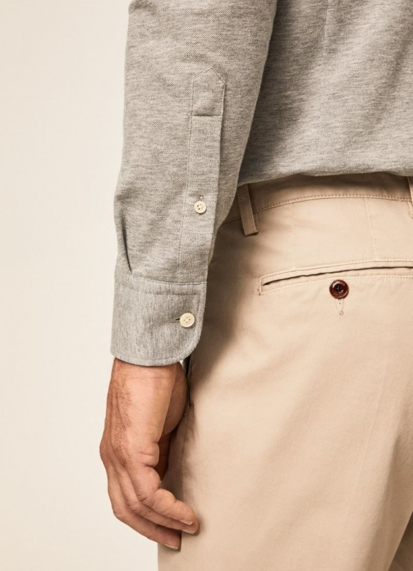 Cette chemise en tissu piqué et à col boutonné se caractérise par sa polyvalence ; elle peut être portée parfaitement avec l'un de nos costumes trois pièces intemporels ou notre pantalon chino classique, et des mocassins en daim de notre dernière collection.