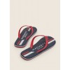 Tongs basiques avec bride en caoutchouc flexible à 3 points et semelle intérieure avec logo en relief accompagnée d'un design rayé bicolore. Le logo en relief de notre marque se détache sur la bande en caoutchouc, assorti au design de la semelle intérieure.