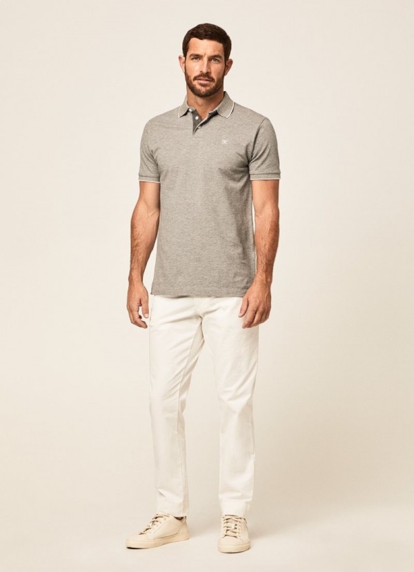 This modern short-sleeved polo shirt manufactured using cotton fabric stands out for its elegant trim on the collar and for other details that are synonymous with sophistication, such as the printed pattern on the inside collar band. Its striking structure is ideal to combine with some classic designs from our line of jeans.