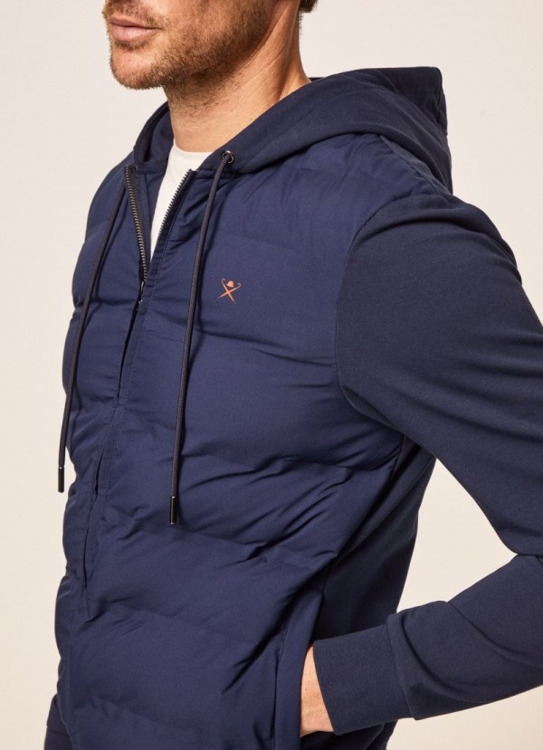 This hybrid jacket is a versatile garment that pairs nicely with our modern powerflex jeans, and T-shirts. It presents a functional design with an adjustable hood and a padded front to ensure greater warmth.