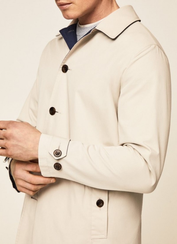 This soft-touch cotton twill trenchcoat is fully reversible. It presents a classic design with buttoned belt loops, a shirt collar, and our brand's metallic branding on the inside and outside of the collar.