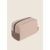 This toiletry bag is constructed with water repellent nylon and elegant nubuck details. It has a main compartment and a second outer pocket with a zipper.