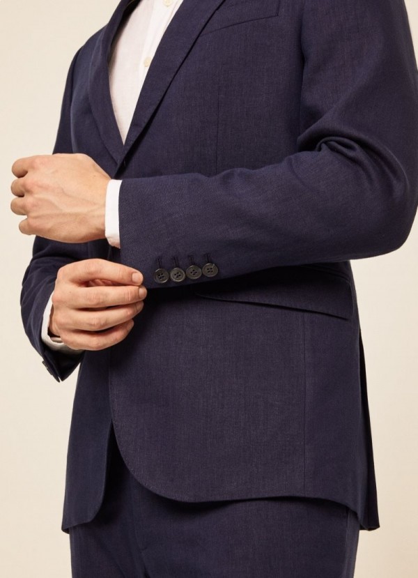 Izrađeno od rastezljive lanene tkanine talijanske proizvodnje, ovo odijelo nudi i lakoću i prozračnost. Hlače imaju dva stražnja džepa na kopčanje, dok jakna ima dva džepa s preklopom i još jedan na prsima.