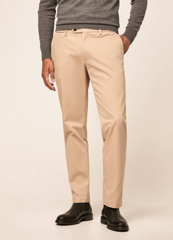 Sanderson szabású chino nadrág egyenes szárral, rugalmas pamutból. Ez a nadrág ideális alternatívája a klasszikus chino-nak, és tökéletesen passzol a kabáthoz és a tornacipőhöz.