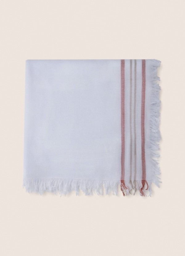 Ceadaíonn stíl clasaiceach an scairf seo le stripes codarsnachta agus imill frayed duit teaglaim feidhmiúla agus cothromaithe a chruthú. Is cúlpháirtí te, ach éadrom é atá an-úsáideach chun tú féin a chosaint ón fuar.