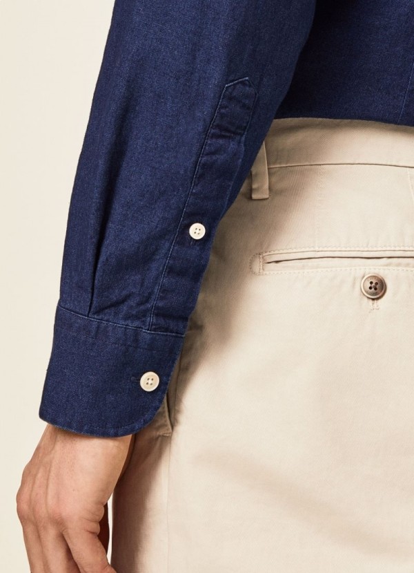 Ideal le haghaidh ócáidí neamhfhoirmiúla, comhcheanglaíonn an léine denim cadáis 100% seo go foirfe lenár jeans agus sneakers. Tá oiriúnach caol in éineacht lenár gcoiléar kent tréithiúil agus nigh dorcha atá i gcodarsnacht go foirfe leis na cnaipí bána.
