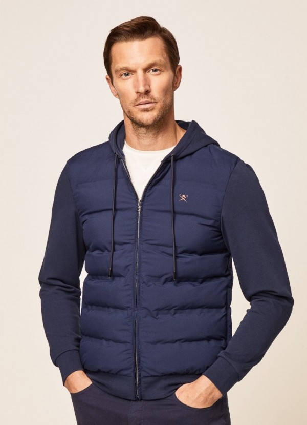 Deze hybride jas is een veelzijdig kledingstuk dat goed te combineren is met onze moderne powerflex jeans en T-shirts. Het heeft een functioneel ontwerp met een verstelbare capuchon en een gewatteerde voorkant om meer warmte te garanderen.
