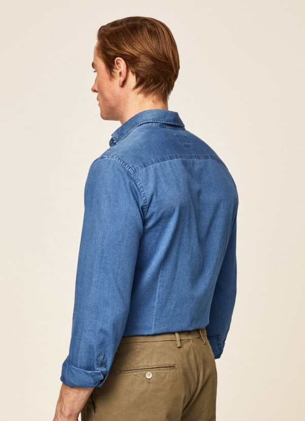 Ideaal voor informele gelegenheden, dit 100% katoenen denim shirt combineert perfect met onze jeans en sneakers. Het heeft een slim fit en onze kenmerkende kent kraag, met een medium blauwe wassing die perfect contrasteert met de witte knopen.