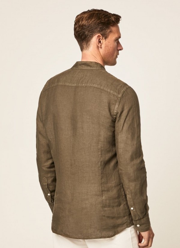 Denne slim-fit skjorten produsert i 100 % lin ved bruk av plaggfargeteknikken er tilgjengelig i et bredt utvalg sommerfarger. Den har en sofistikert mandarinkrage og vår matchende broderte logo på brystet.