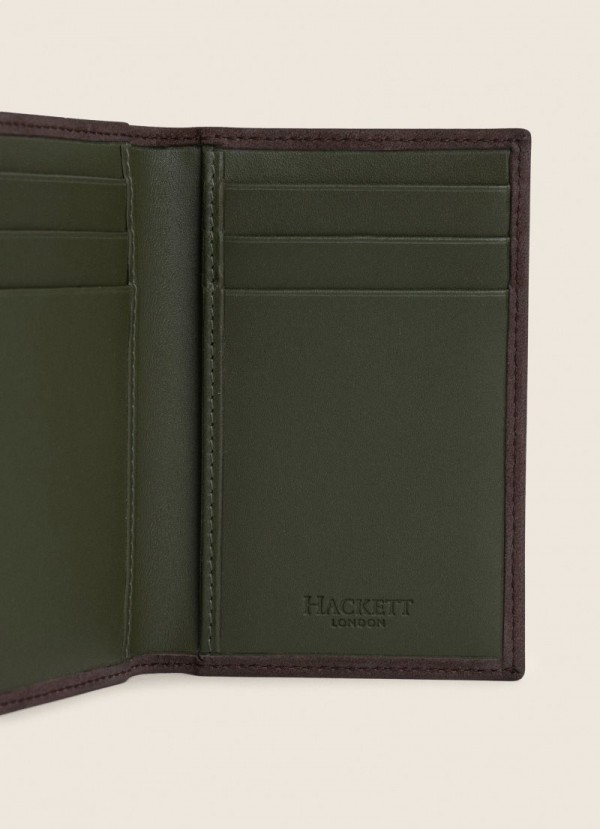 Esta carteira nobuck apresenta um design interior de couro e aplique com nosso logotipo de nÃquel escovado na frente. É um acessório confortável que tem diferentes espaços para cartões e dois compartimentos para notas.