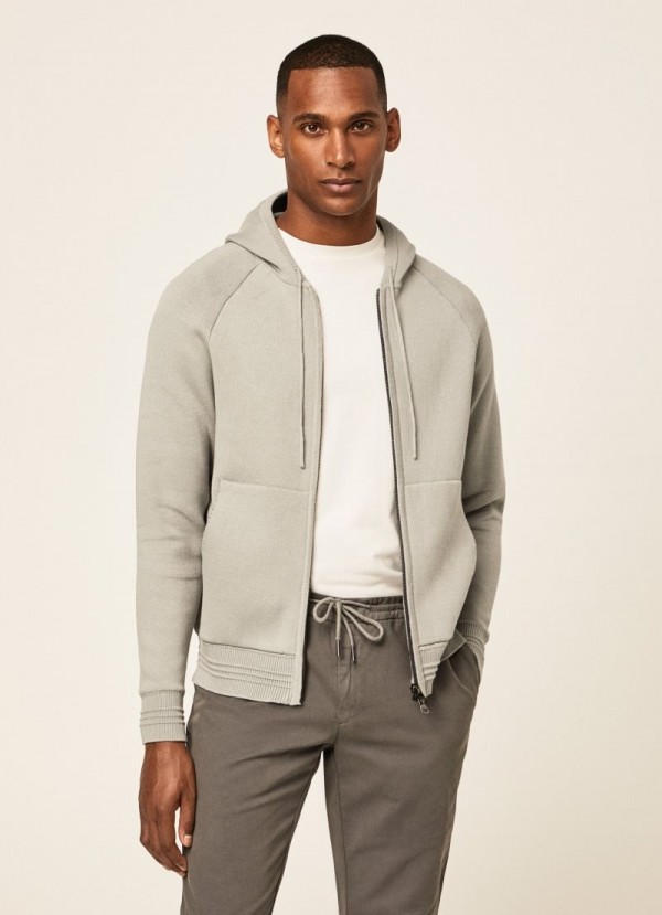 - Jachetă tricotată din bumbac Pima - Închidere centrală cu fermoar - Glugă reglabilă cu snur - Buzunar cangur - Detalii striate pe manșete și tiv - Compoziție: 100% Bumbac