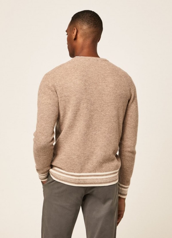 Tillverkad i en blandning av merinoull och kashmir, denna stickade jersey har tillräcklig struktur och värme för de svala, ljumma nätterna. Den presenterar ribbade detaljer på sin runda krage, samt på ärmslut och fåll, där den också visar ränder i kontrasterande färg.