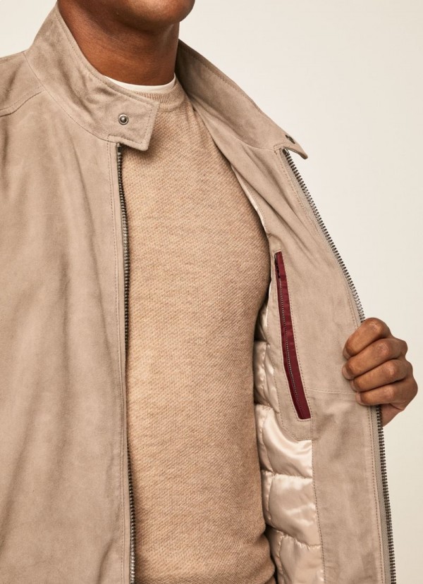 Táto semišová bunda Harrington je odev, ktorý nesmie chýbať vo vašom šatníku. Vyznačuje sa elegantnými detailmi, ako je mandarínkový golier so zapínaním na patentky, obojsmerný zips a predný ramenný šev.