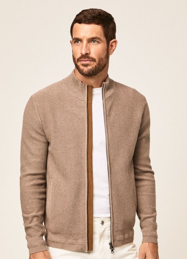 Pletená bunda vyrobená z kombinácie bavlny a kašmíru pre hebký dotyk. Má zapínanie na zips so semišovou chlopňou, vďaka ktorej je vyšší ako bežný zips.