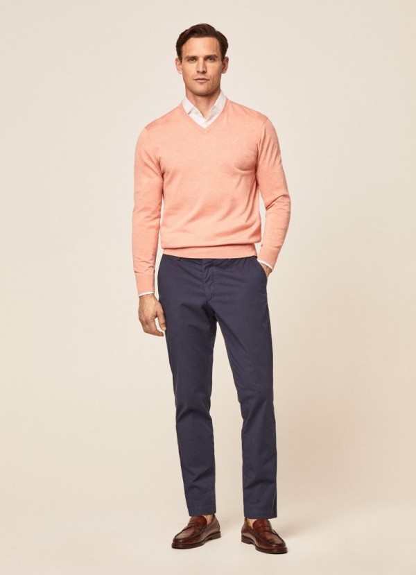Pamuk ve ipekten üretilen V yakalı jarse. Bu hafif jarse, nefes alabilirliği sayesinde tüm yıl boyunca hafta sonu görünümü için ideal bir giysidir. 5 cepli pantolonlarımızdan biriyle kombinleyin.